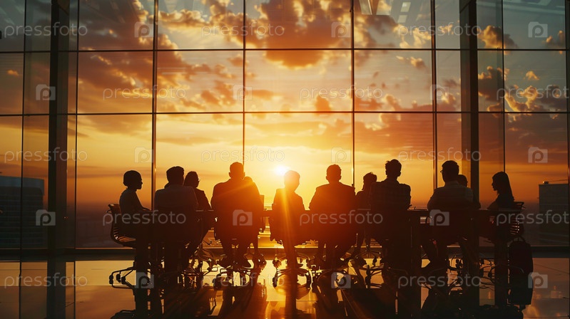 Совместная работа команды в офисе со стеклянными стенами на закате