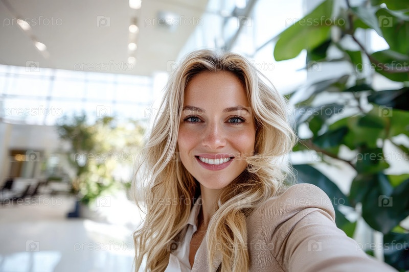 Профессиональное селфи в современном зеленом офисе с солнечным светом и растениями