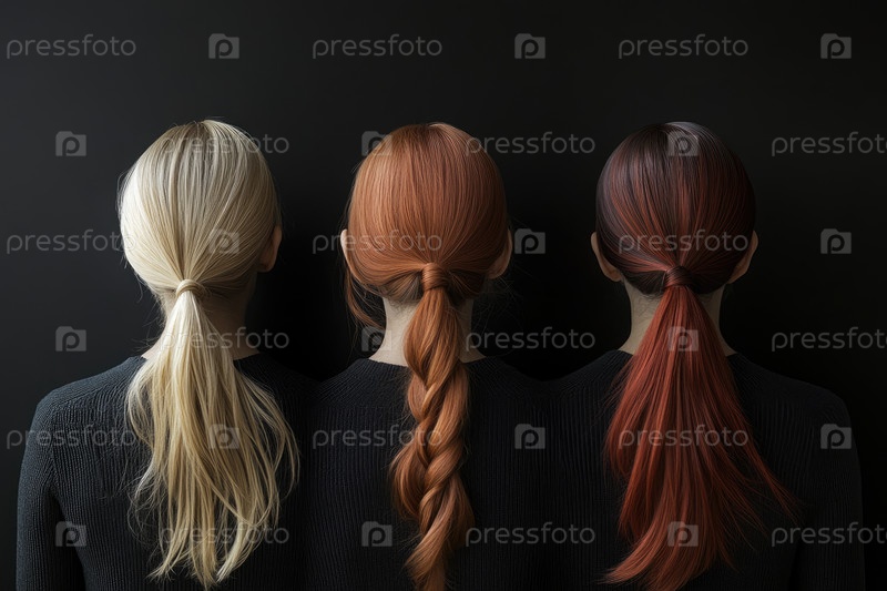 Фотография, демонстрирующая вид сзади трех человек с элегантно уложенными хвостиками в оттенках блонда, светло-каштанового и брюнета, подчеркивающая различную текстуру волос и эстетику