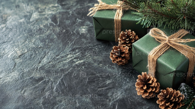 Красиво упакованные зеленые подарки с шишками и еловыми ветками