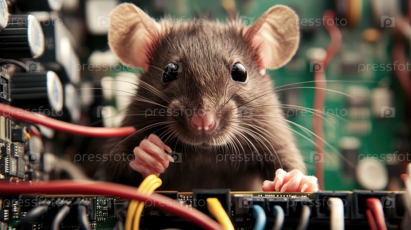 Любопытный грызун исследует запутанные кабели в современной среде