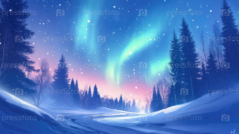 Волшебный зимний лес, освещенный северным сиянием