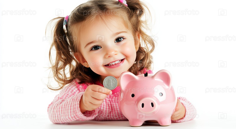 Ребенок держит розовую копилку и готовится опустить в нее монету, что символизирует важность сбережения денег с раннего возраста