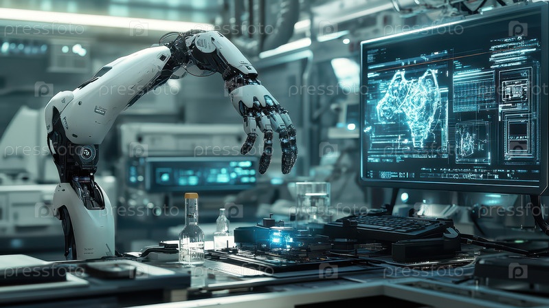 Высокотехнологичная футуристическая лаборатория, оснащенная роботизированной рукой, светящимися цифровыми экранами и высокотехнологичными исследовательскими инструментами на базе искусственного интеллекта