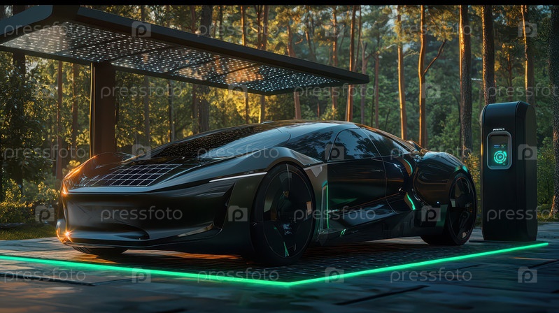 Футуристический электромобиль на солнечных батареях заряжается в лесу