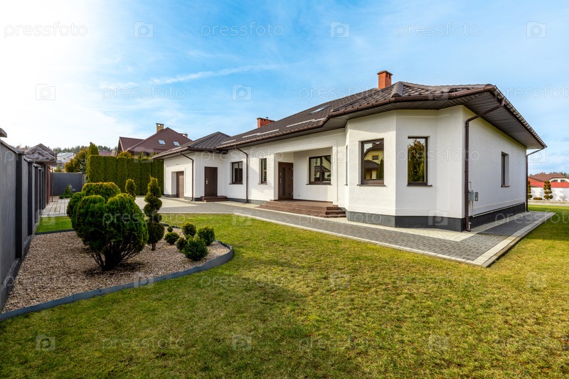 Современный загородный дом с зеленым садом и гаражом