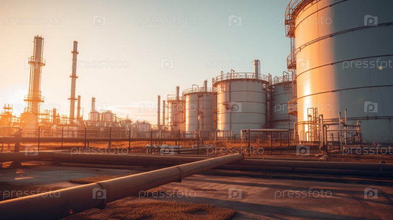 Трубопровод и трубная эстакада нефтяного промышленного завода на фоне закатного неба