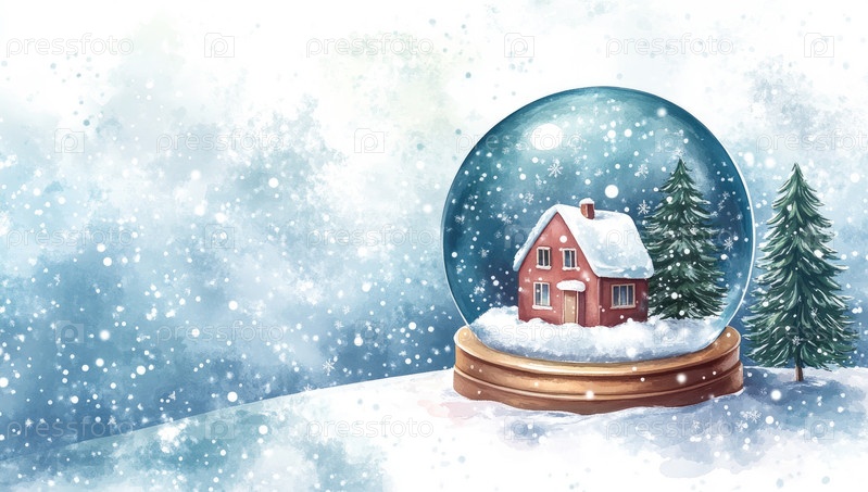 Уютный домик в заснеженном лесу и декоративный снежный шар с рождественской елкой создают волшебную зимнюю картину
