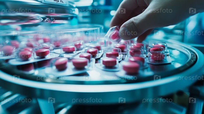 На фармацевтической фабрике рабочий тщательно отбирает розовые и белые таблетки на конвейерной ленте, что подчеркивает точность современного производства лекарств