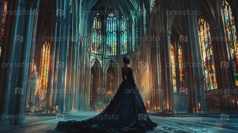 Таинственный готический интерьер церкви, освещенный светом свечей, с замысловатыми витражами, бросающими разноцветный свет на женщину в струящемся темном платье
