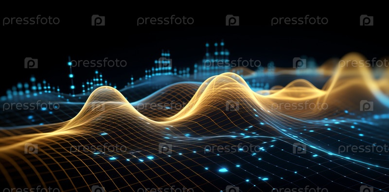 Абстрактные синие и желтые волны на темном фоне и огни боке