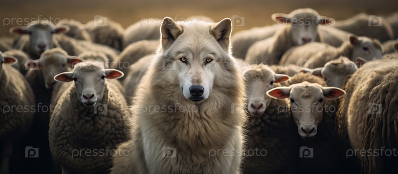 Волк в стаде овец с шерстяной одеждой. Волк притворяется овцой