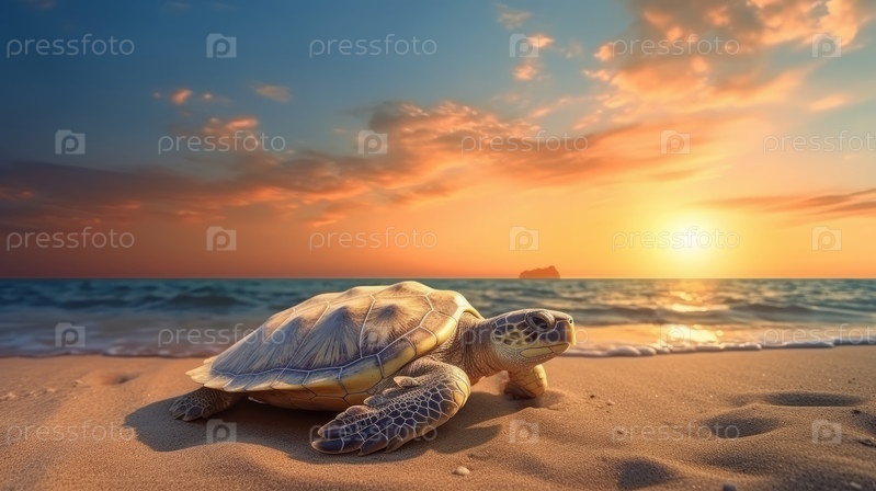 Маленькая морская черепаха на песчаном пляже утром