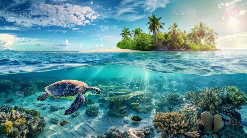 Морская черепаха плывет в океане тропического острова