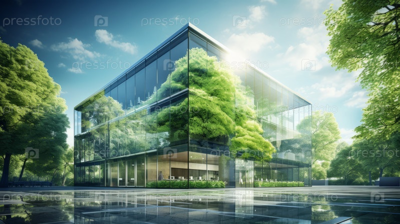 Устойчивое зеленое здание. Экологичное здание. Устойчивое стеклянное офисное здание с деревом для снижения уровня углекислого газа. Офис с зеленой средой. Корпоративное здание снижает уровень CO2. Безопасное стекло