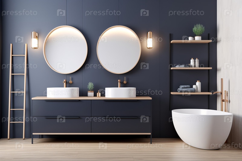 Современный интерьер ванной комнаты со стенами в сине-белых тонах, бетонным полом, деревянной тумбой с черной раковиной и овальным зеркалом, белой ванной, панорамными окнами