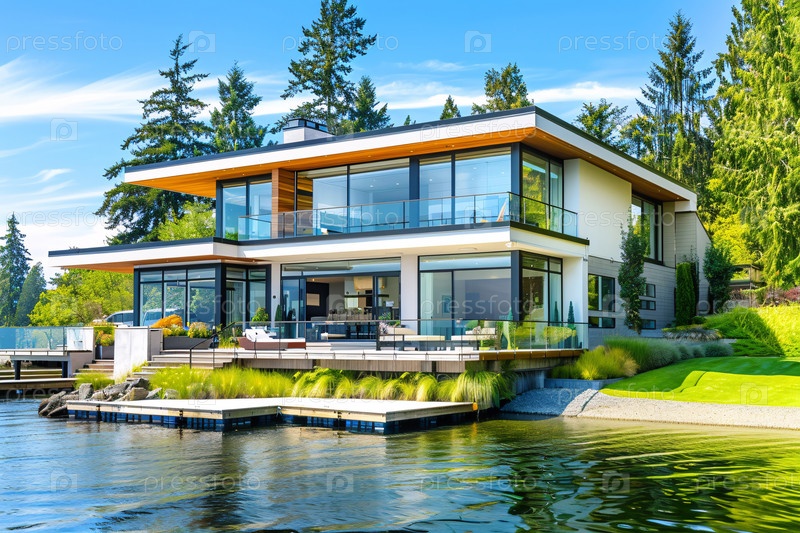 Элегантный современный дом на берегу озера с большими стеклянными стенами и пирсом