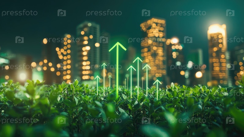 На изображении изображен яркий рост растений под неоновыми стрелками, символизирующий прогресс в области городских экологически чистых инноваций
