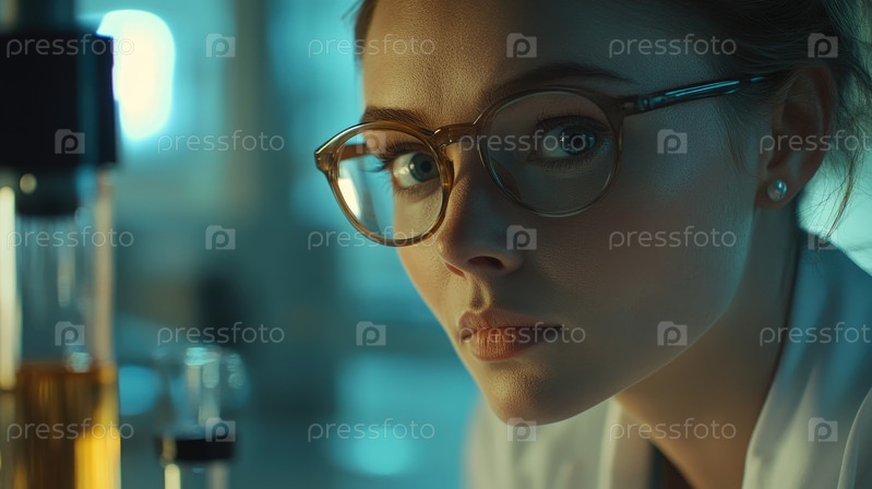 Ученый проводит подробный химический анализ в хорошо оборудованной лаборатории, окруженной различным научным оборудованием и стеклянной посудой