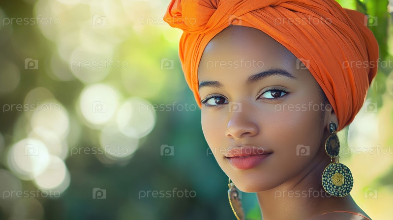 На снимке изображен человек в ярко-оранжевом тюрбане и с декоративной серьгой на фоне пышной тропической зелени