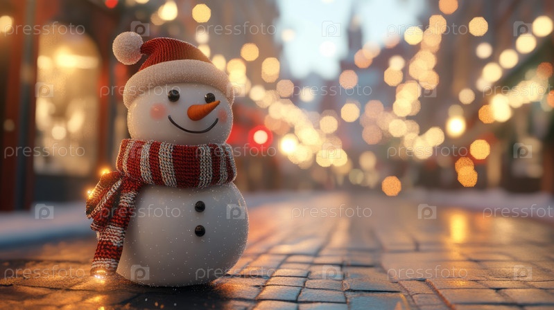 Праздничный снеговик в огнях ночного города