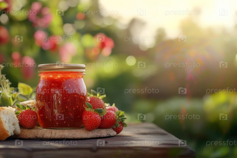 Деревенская обстановка на открытом воздухе, где на деревянном столе представлена свежая клубника и домашнее варенье в сочетании с хрустящим хлебом