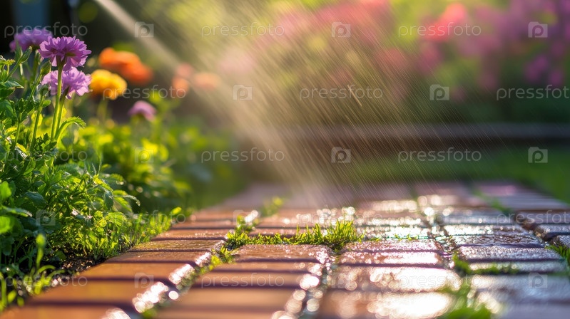 Используя мойку высокого давления, человек очищает от грязи садовый дворик, освежая открытое пространство
