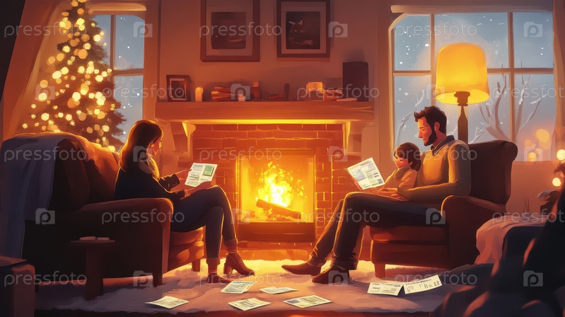 Семья наслаждается уютным зимним вечером у камина с оплатой счетов