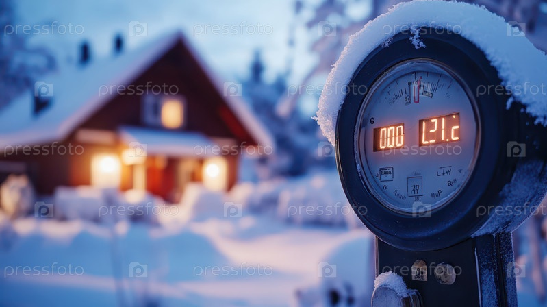 Замерзший счетчик отопления снаружи заснеженного дома