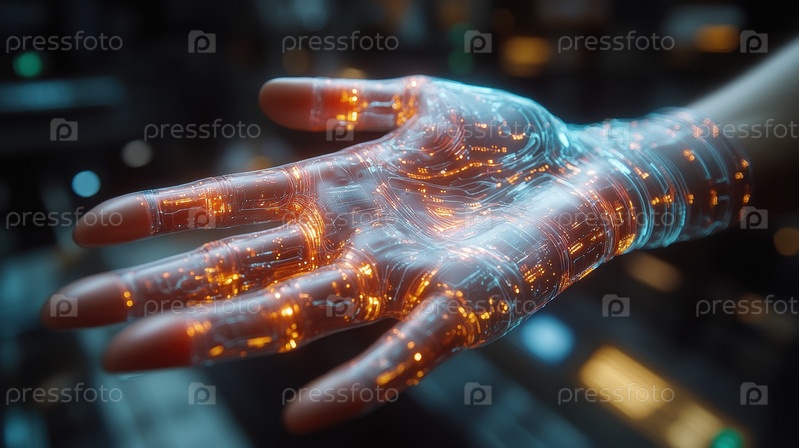 Футуристическая кибернетическая рука со светящимися цепями