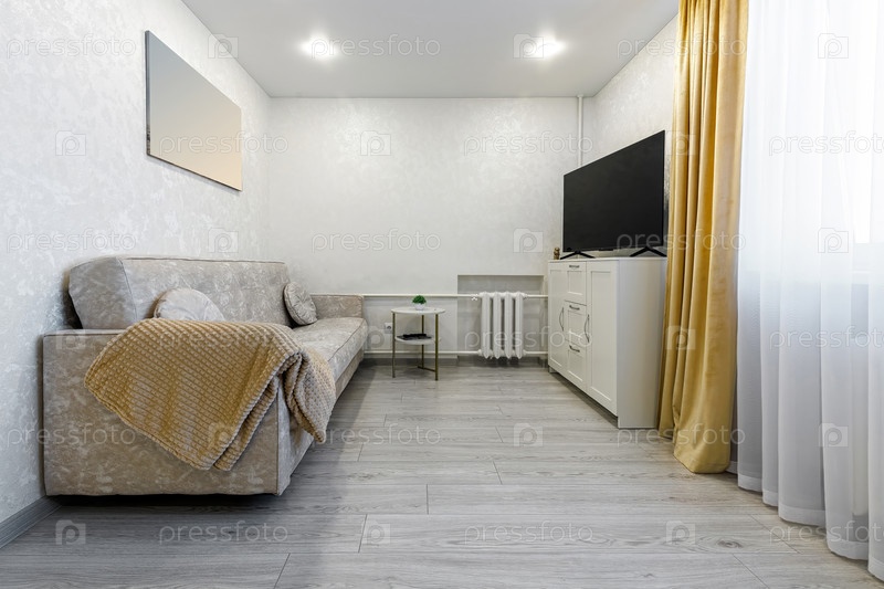 Уютная гостиная с мягким бежевым диваном, белой мебелью, телевизором и большими окнами с желтыми шторами, создающими теплую и уютную атмосферу