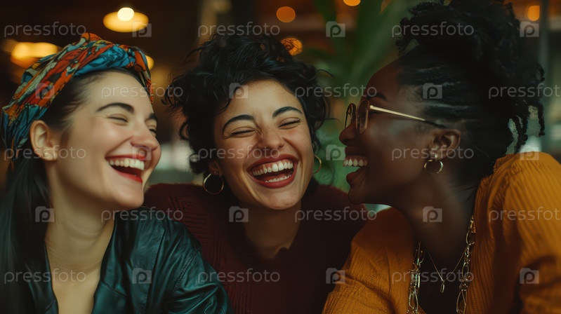 Группа разнообразных друзей, смеющихся вместе в уютном кафе