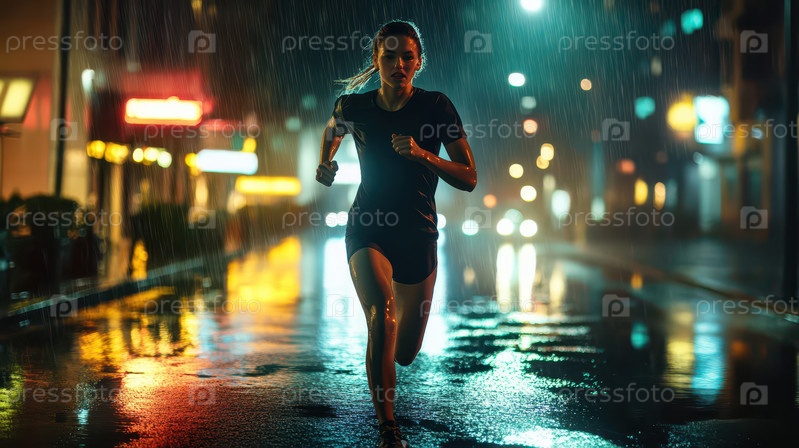 Женщина бежит под дождем в неоновом городе