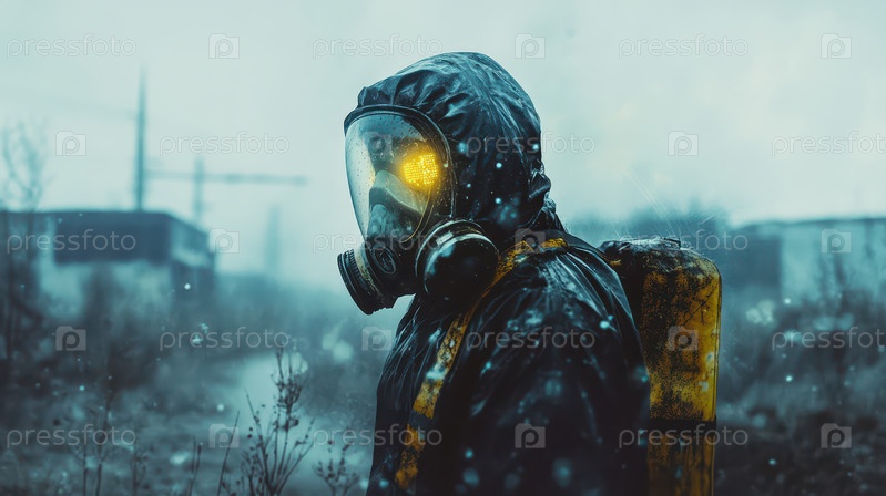 Работник по охране труда в токсичной среде с горящей противогазной маской