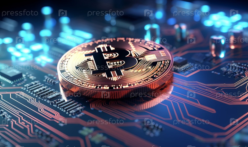 Монета Bitcoin находится на сложном чипсете, метафорически олицетворяя процессы цифрового майнинга и транзакций криптовалюты