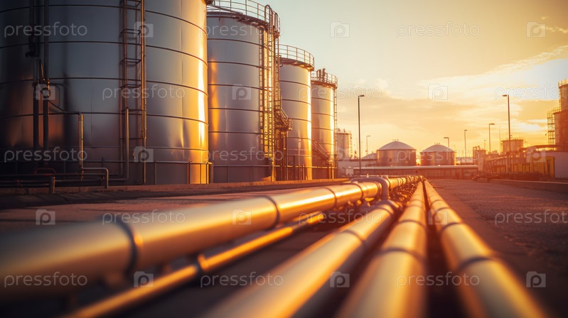 Трубопровод и трубная эстакада нефтяного промышленного завода на фоне закатного неба