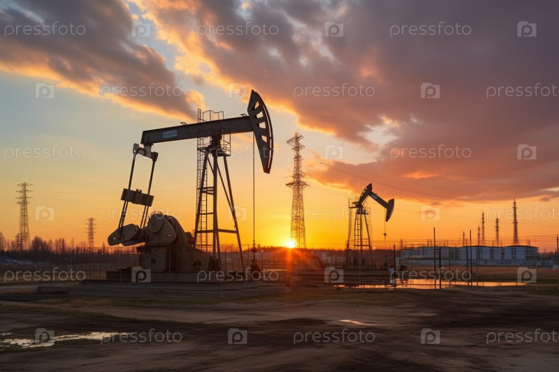 Нефтяная буровая машина в пустыне, промышленность, энергетика, заправочная станция на закате