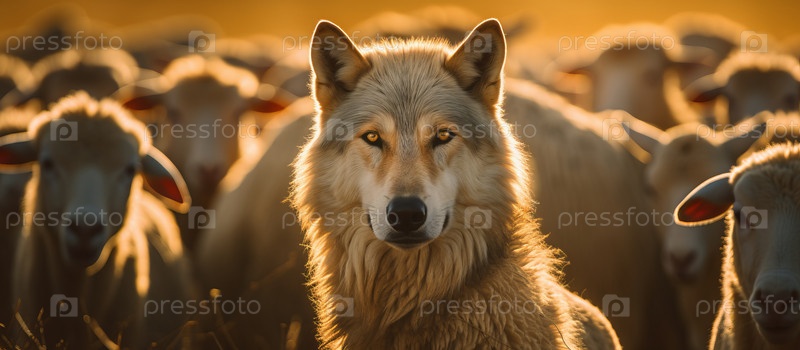 Волк в стаде овец с шерстяной одеждой. Волк притворяется овцой