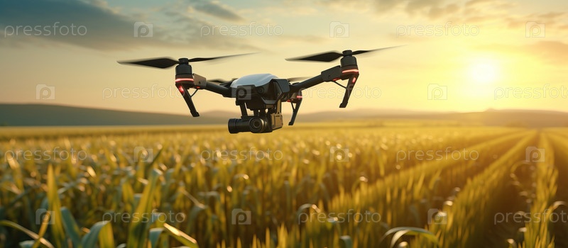 Беспилотный квадрокоптер на зеленом кукурузном поле