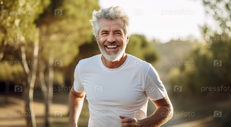 Портрет счастливого пожилого мужчины с седыми волосами и бородой в спортивной одежде