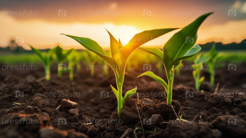 Ряды кукурузных саженцев, растущих на коричневом вспаханном поле на закате. Они символизируют усилия, новое начало, свежесть, чистоту и тепло