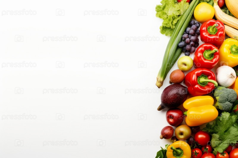 Композиция из фруктов и овощей, изолированных на белом фоне. Красивая широкая рамка со свободным пространством для текста. Коллаж