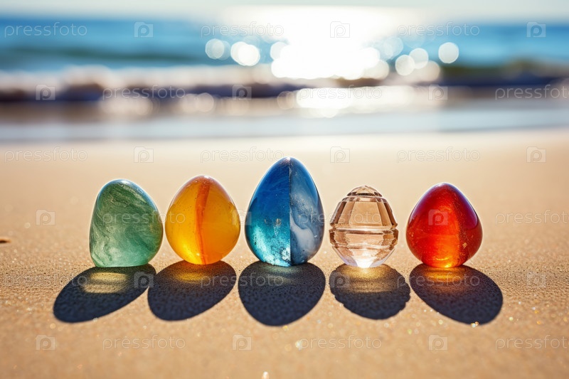 Яркие, красочные стеклянные драгоценные камни сверкают на солнце на песчаном пляже на фоне океана