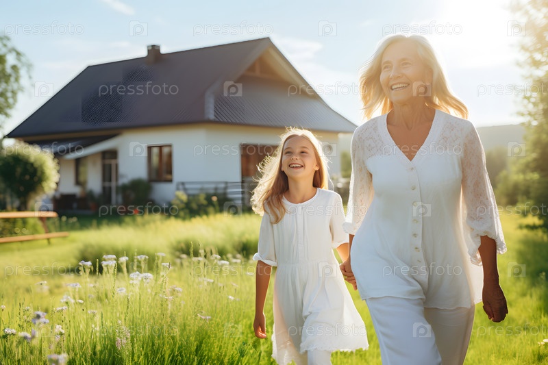 Пожилая женщина держит за руку внучку, гуляющую в парке