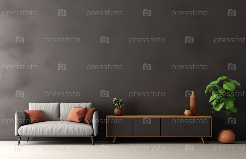 Серая гостиная с маленьким белым диваном и прямоугольным журнальным столиком. Макет