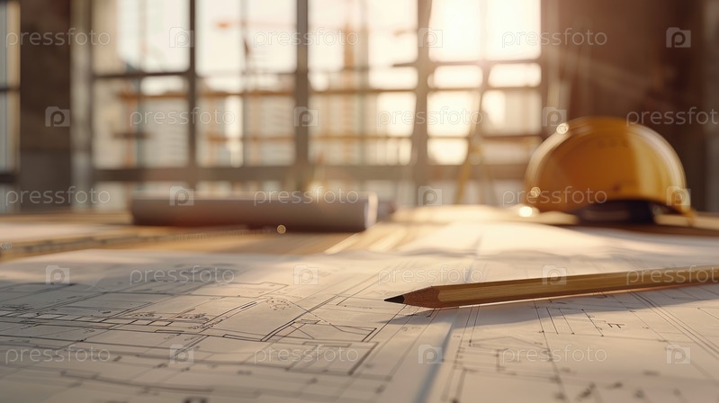 На этом снимке изображено рабочее пространство, заполненное архитектурными чертежами, карандашами и защитной каской, что указывает на активную сессию планирования строительства, освещенную дневным светом