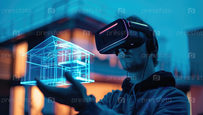 Человек использует технологию виртуальной реальности для визуализации подробной голографической модели современного дома, иллюстрирующей передовое архитектурное планирование