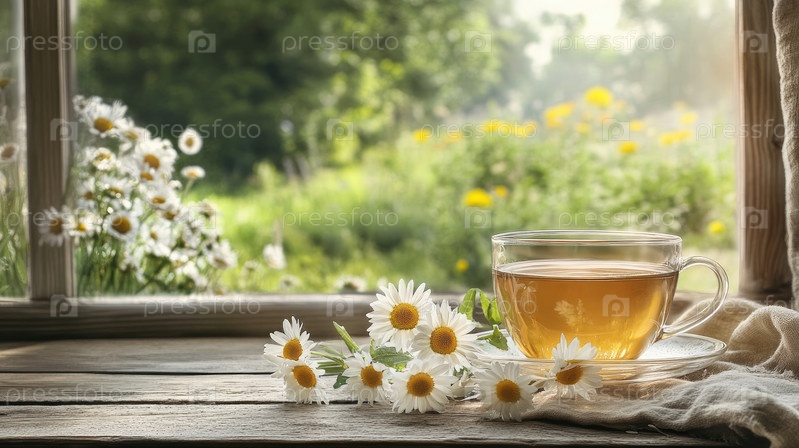 Чашка ромашкового чая, украшенная цветками ромашки, подарит момент спокойствия и расслабления