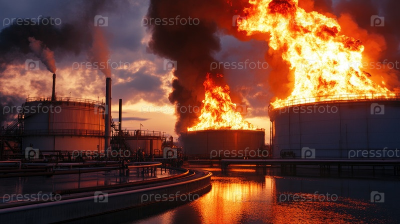 Интенсивный пожар, охвативший промышленное нефтехранилище ночью