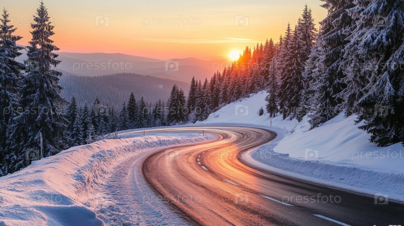Извилистая дорога петляет по заснеженному горному ландшафту под потрясающим закатом